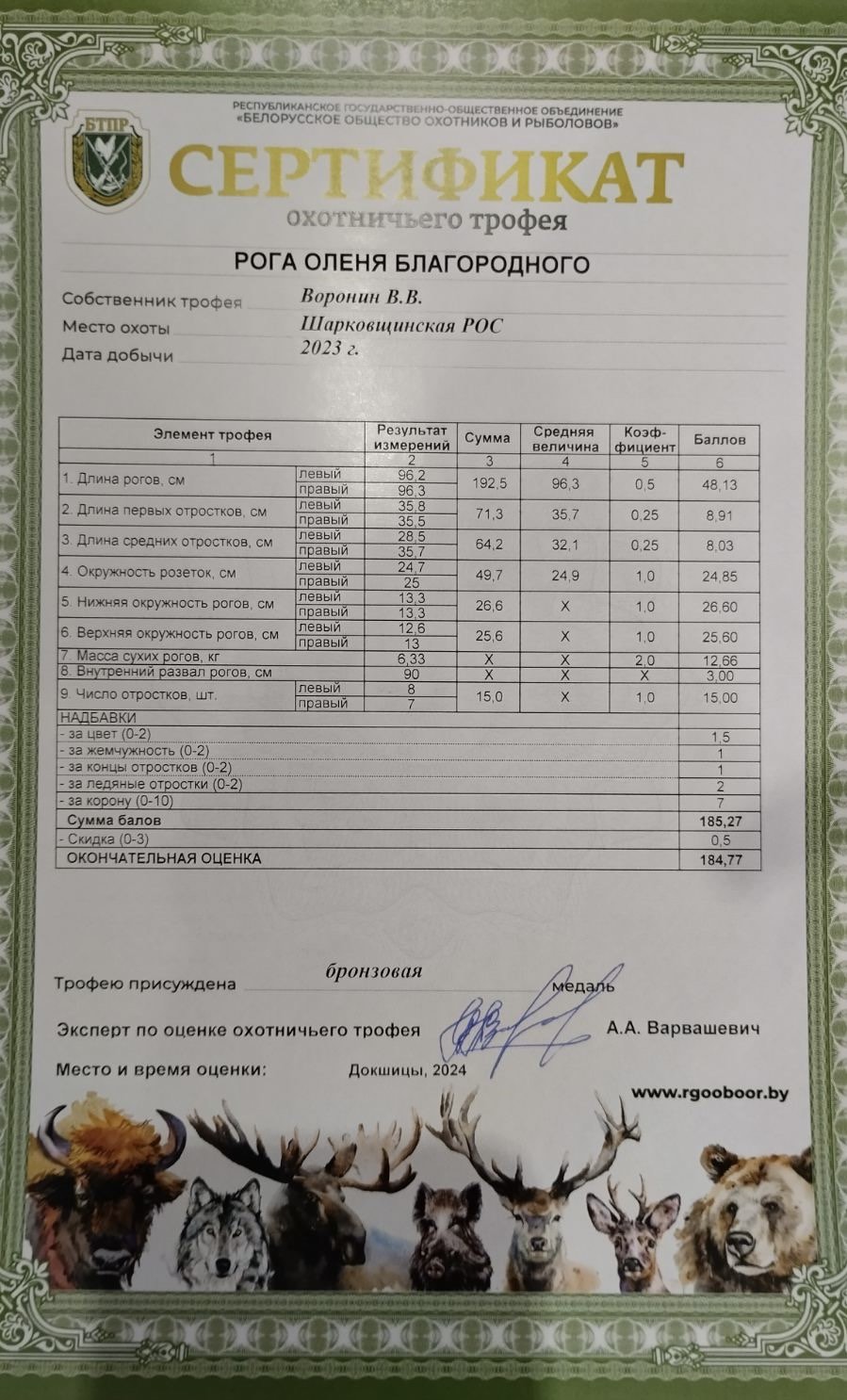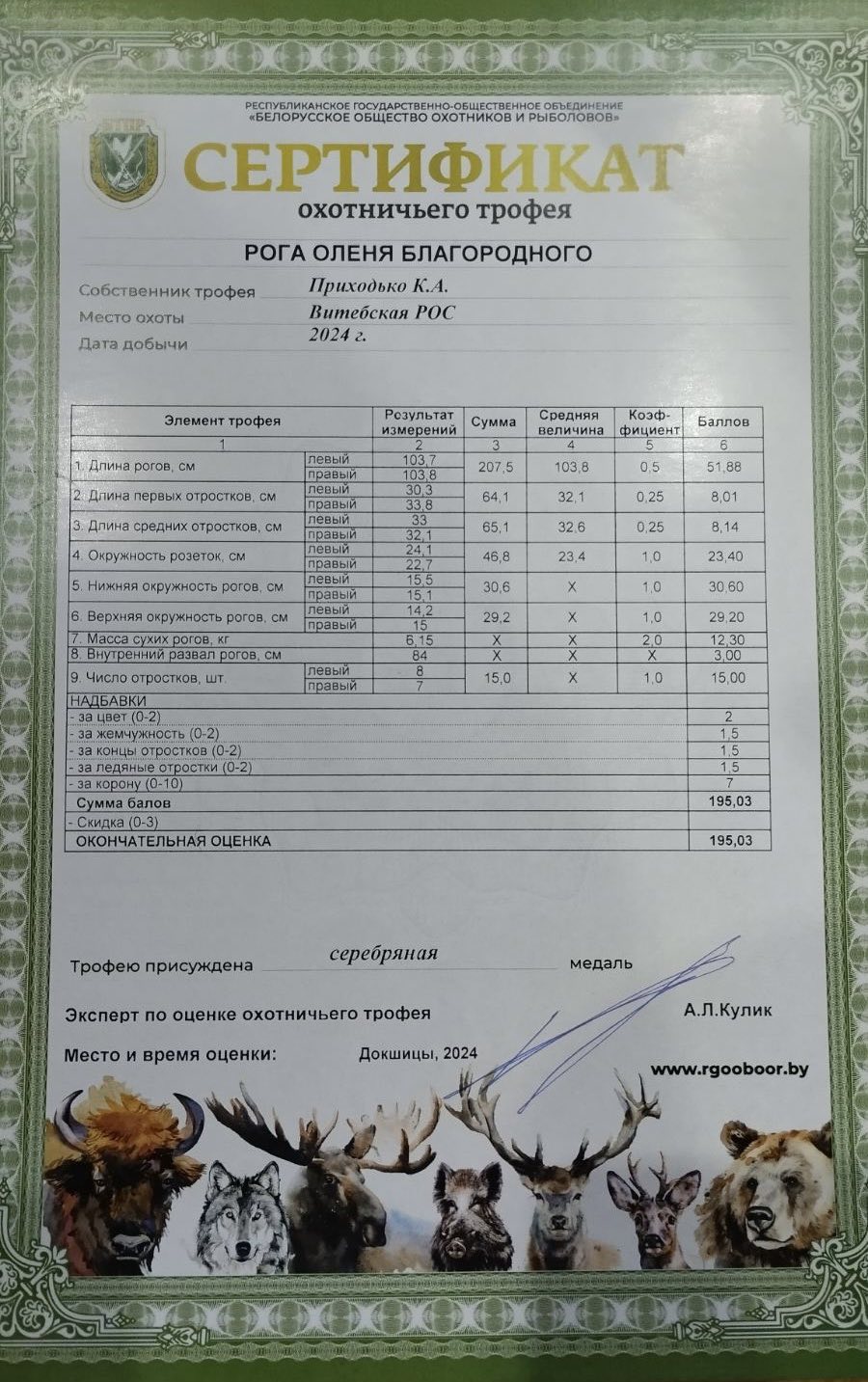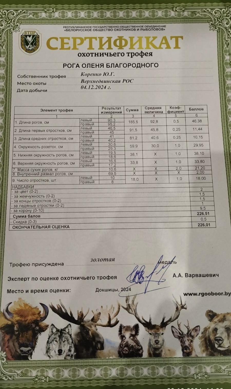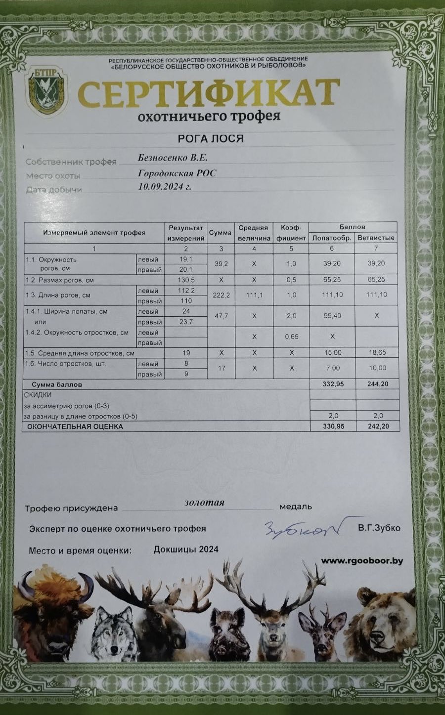 В Витебской области 23-24 декабря 2024 года на базе учреждения «Докшицкая МРОС» РГОО «БООР» проходит бесплатная оценка охотничьих трофеев, по итогам которой результат вносится в Национальную трофейную книгу Республики Беларусь, а охотнику выдается сертификат оценки охотничьего трофея.